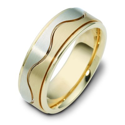 14 kt two-tone hand made comfort fit Wedding Band 6.5 mm wide. The center has a curvy carved line and is a matte finish. The outer edges are polished. Different finishes may be selected or specified.