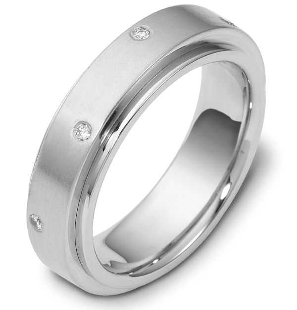 Platinum center rotating, 6.0 mm wide diamond spinning wedding band. Diamond total weight is 0.12 ct in size six. Diamonds are graded as VS in clarity H in color. The center of the ring is spinning and is a matte finish. The outer edges are polished. Different finishes may be selected or specified.