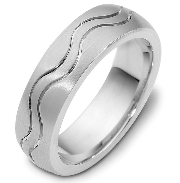 14 kt white gold, hand made comfort fit Wedding Band 7.0 mm wide. The ring is a matte finish. Different finishes may be selected or specified.
