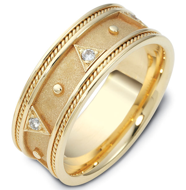 18K Gold 8.5 mm wide, comfort fit, 0.15 ct diamond ring. Diamonds are graded as VS in clarity G-H in color. There is one hand crafted rope on each side of the band. The center of the band is a coarse and heavy sandblast finish. The rest of the band is polished. Different finishes may be selected or specified.