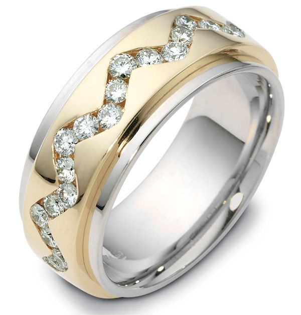 14K, two-tone, 9.0 mm wide, comfort fit, diamond wedding band. Diamonds total weght is 1.20 ct. Diamond weight is estimated for size 6.0 ring, are graded as VS1 in Clarity G in Color. The center of the ring rotates and spins. The ring is a polished finish with matte center. Different finishes may be selected or specified.
