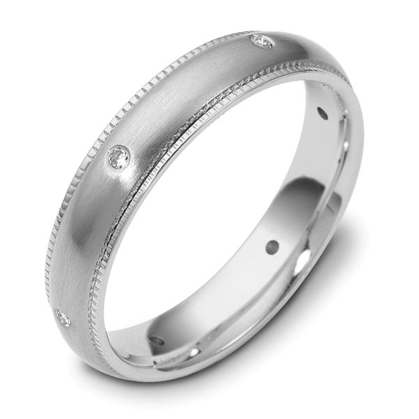 14K White gold diamond milgrain edge, comfort fit, 4.5mm wide wedding band. The ring has 0.09 ct tw diamonds that are VS1-2 in clarity and G-H in color. There are 6 round brilliant cut diamonds, each measures 0.015 ct. The center portion of the ring has a matte finish. Different finishes may be selected or specified.