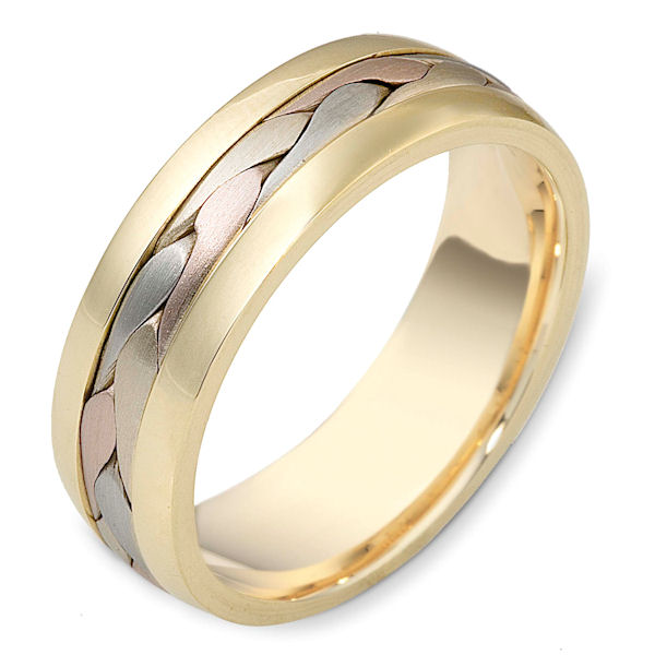 14 K white, rose, and yellow gold, 7.0 mm wide, comfort fit, braided wedding band. The braid in the center is hand crafted with a matte finish. The outer edges are polished. Different finishes may be selected or specified.