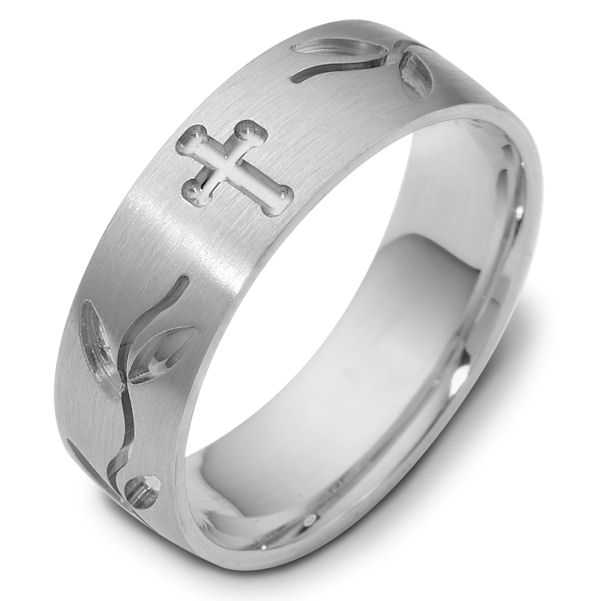 18K Cross and Leaves Carved Wedding Band. 7.0 mm Wide. The ring has a matte finish and the carved crosses and leaves have a polished finish. Different finishes may be selected or specified.