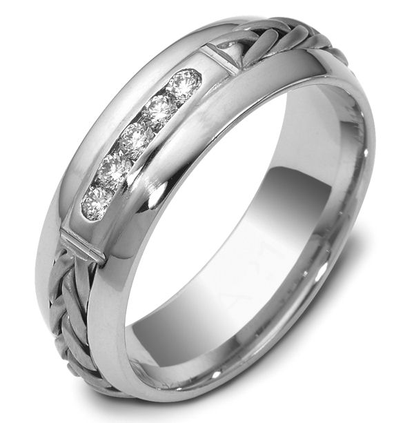 18 K White gold 7.0 mm. wide, diamond ring. Diamonds total weight is 0.22 ct. Diamonds are VS1-2 in clarity G-H in color. There is a handcrafted braid on each side of the diamonds. The braid is a brush finish and the outer edges are polished. Different finishes may be selected or specified.
