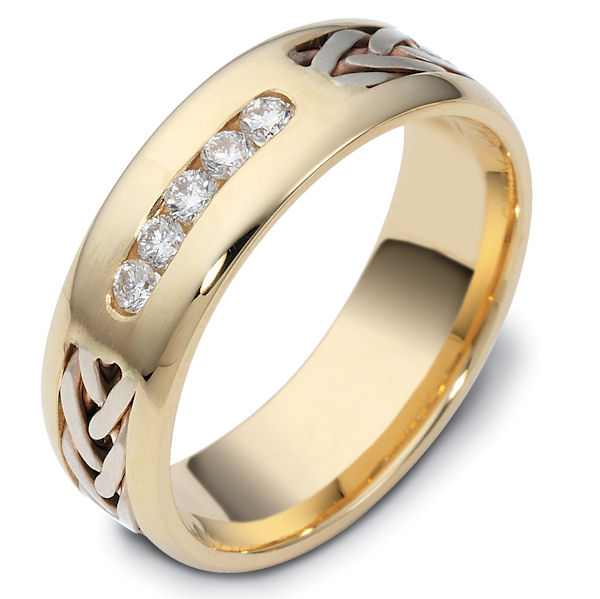 14 K yellow or white gold 7.0 mm. wide, diamond ring. Diamonds total weight is 0.22 ct . Diamonds are VS1-2 in clarity G-H in color. There is a hand crafted braid on each side of the diamonds. The braid and center portion around the diamonds have a brush finish. The rest of the band is polished. Different finishes may be selected or specified.