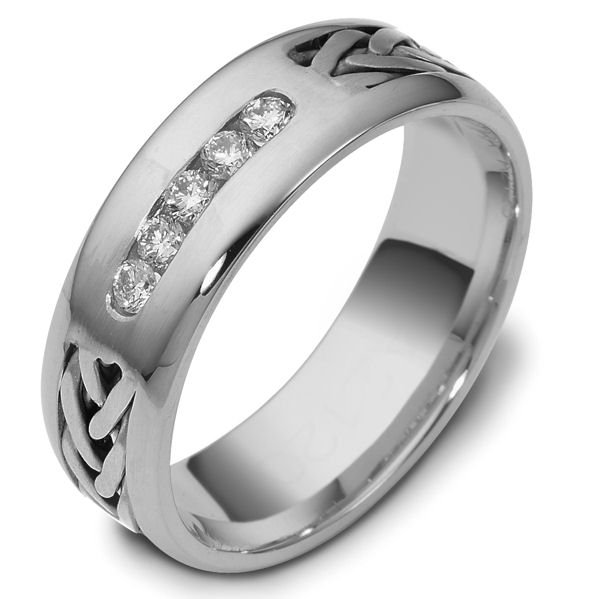 18 kt white gold 7.0 mm. wide, diamond ring. Diamonds total weight is 0.22 ct . Diamonds are VS1-2 in clarity G-H in color. There is a hand crafted braid on each side of the diamonds. The braid and center portion around the diamonds have a brush finish. The rest of the band is polished. Different finishes may be selected or specified.