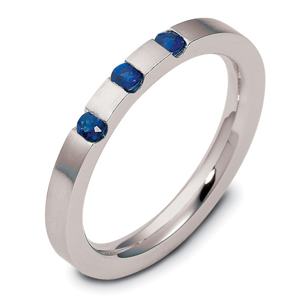 Palladium, 2.5 mm wide, comfort fit, 0.12 ct total weight blue sapphire band. The ring has a matte finish. Different finishes may be selected or specified.