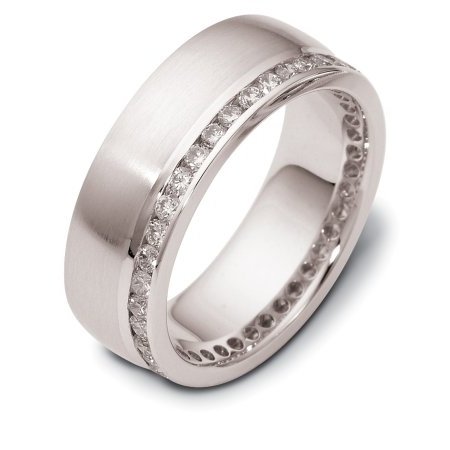 Platinum, 8.0 mm. wide diamond ring. Diamonds total weight is 0.80 ct in size 6.0. Diamonds are VS1-2 in clarity G-H in color. The ring has a matte finish and there is a polished line near the diamonds. Different finishes may be selected or specified.
