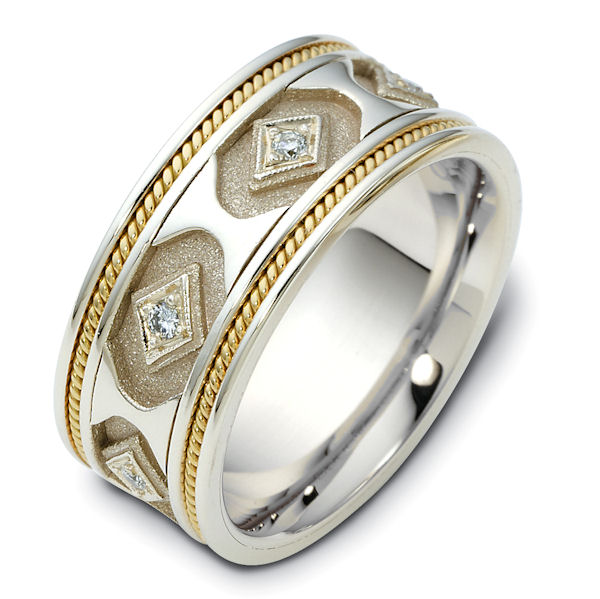 14 K white, yellow or two tone, 8.5 mm wide, hand made diamond ring. Diamond total weight is approximately 0.14 ct in size 6.0. Diamonds are VS1-2 in clarity G-H in color. There are one handcrafted rope on each side of the ring. The grooves have a coarse and heavy sandblast finish. The rest of the ring has a polished finish. Different finishes may be selected or specified.