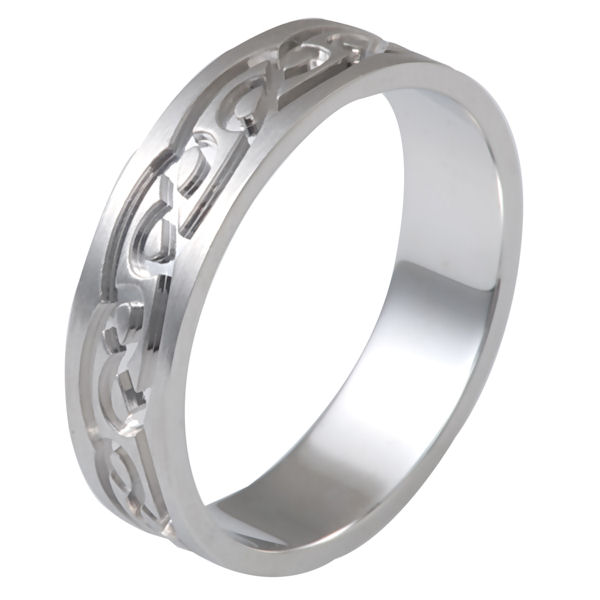 Platinum, classic, 5.0 mm wide, wedding band. The ring has a beautiful carved celtic pattern around the whole ring. It is 5.0 mm wide. Other finishes may be selected or specified.