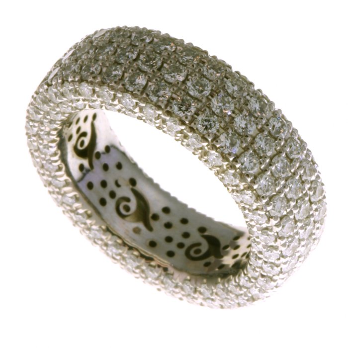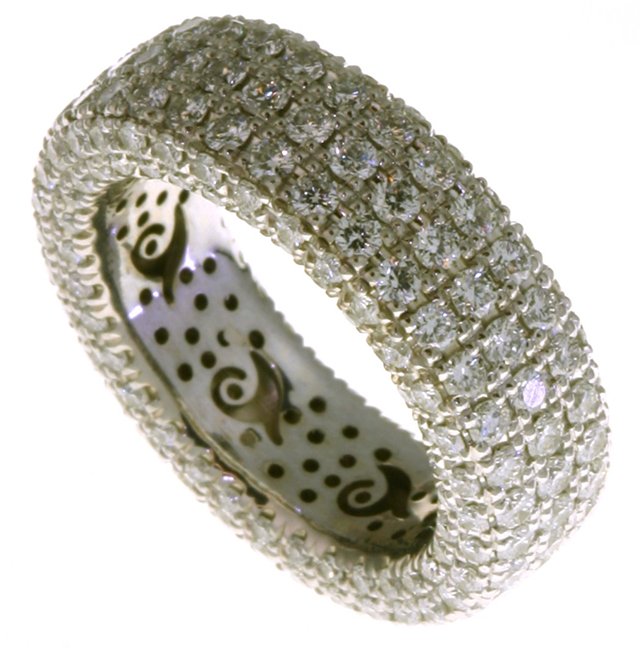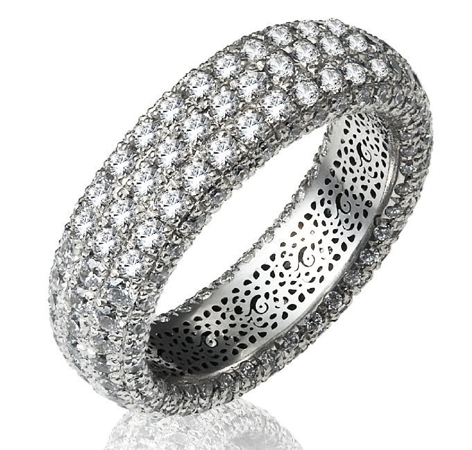 Platinum, diamond eternity ring. The ring pave set holds 266 diamonds in size 7 with diamond total weight of approximately 3.16ct. The diamonds are seven rows and each row contains 38 round brilliant diamonds. The diamonds are graded as VS in clarity G-H in color.