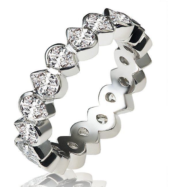 Platinum, diamond eternity ring. The ring holds 19 matching pear shape diamonds each measures 4.0X2.0 mm in size 7.0 ring. The diamonds together weigh approximately 3.80ct in size 7.0. The diamonds are graded as VS in clarity G-H in color.