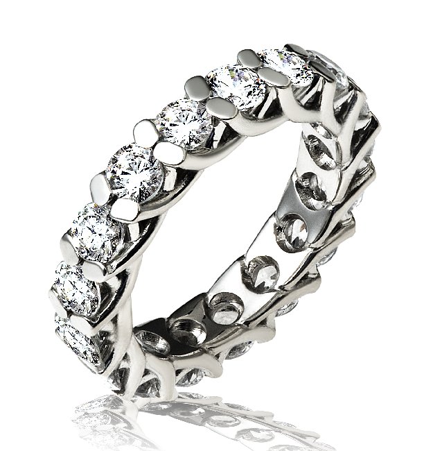 Palladium, diamond eternity ring. The ring holds 17 round brilliant in size 7.0. The diamonds have excellent cut, each weighs 0.20ct and together they weigh 3.4ct. The diamonds are graded VS in clarity and G-H in color.