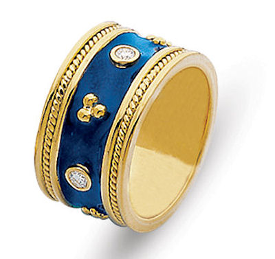 18 kt yellow gold diamond and blue enamel ring. This band has 0.16 ct tw diamonds, VS1-2 in clarity and G-H in color. There is blue enamel in the center of the ring and one handcrafted rope on each side of the band. The band is approximately 10.0 mm wide. The whole ring is polished. Different finishes may be selected or specified.