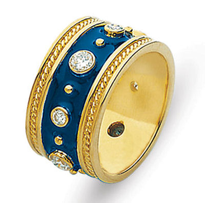 18 kt yellow gold diamond and blue enamel ring. This ring has 0.73 ct tw diamonds, VS1-2 in clarity and G-H in color. There is blue enamel in the center and one handcrafted rope on each side of the ring. The band is approximately 10.0 mm wide. The ring has a polished finish. Different finishes may be selected or specified.