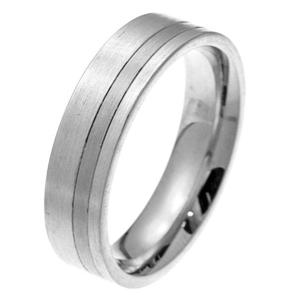 18 kt white gold 6.0 mm wide comfort fit wedding band. The ring is a classic style with a stripe in the center. It is all matte finished, 6.0 mm wide and comfort fit. Different finishes may be selected or specified.