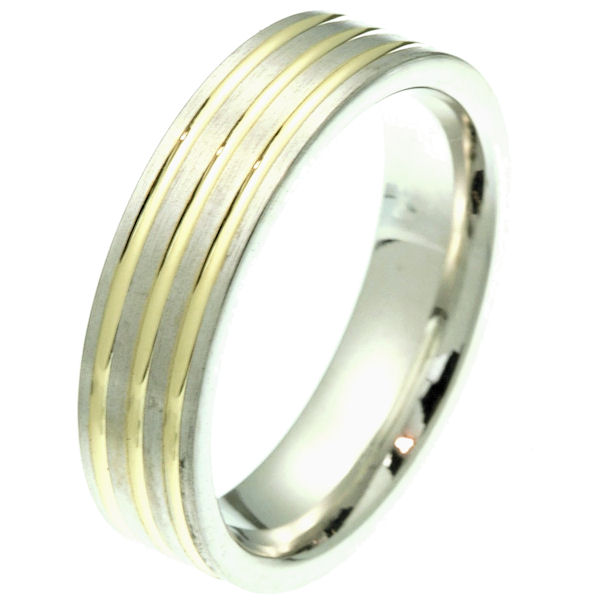 14 kt two-tone gold 6.0 mm wide comfort fit wedding band. The ring has 3 yellow gold grooves that are polished and the white gold portion is matte finish. It is 6.0 mm wide and comfort fit. Different finishes may be selected or specified