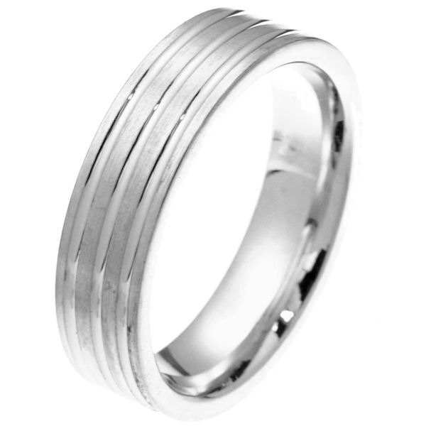 18 kt white gold 6.0 mm wide comfort fit wedding band. The ring has 3 white gold grooves and the rest is matte finish. It is 6.0 mm wide and comfort fit. Different finishes may be selected or specified.
