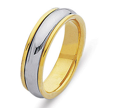 Hand made 14 kt two-tone gold, 5.0 mm wide, comfort fit wedding ring. The ring is a polished finish. Different finishes may be selected or specified.