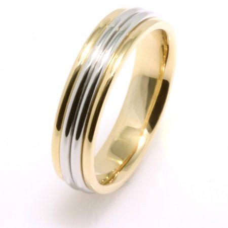 Hand crafted, platinum and 18 kt yellow gold, 5.0 mm wide, comfort fit Wedding Band. The ring is a polished finish. Different finishes may be selected or specified.