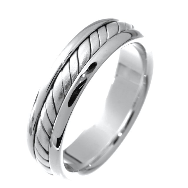 14K White gold, hand crafted, 5.0 mm wide, comfort fit wedding band. There is a handcrafted rope design in the center. The whole ring is a polished finish. Different finishes may be selected or specified.