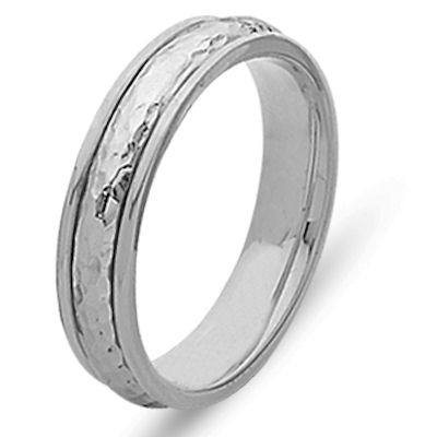18K White gold hand crafted 5.0 mm wide, comfort fit wedding band. The ring has a polished hammered finish in the center and a polish finish on the edges. Different finishes may be selected or specified.