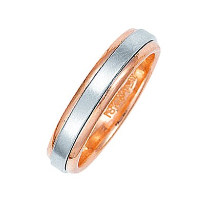 Platinum and 18 kt rose gold classic wedding band. The ring is about 5.0 mm wide and comfort fit. The center of the ring has a soft satin matte finish and the outer edges are polished. Different finishes may be selected or specified.