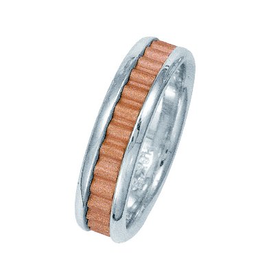 Platinum and 18 kt rose gold classic wedding band. The ring is about 6.0 mm wide and comfort fit. The center of the ring has a unique handcrafted design with a sandblast satin finish. The outer edges are polished. Different finishes may be selected or specified.