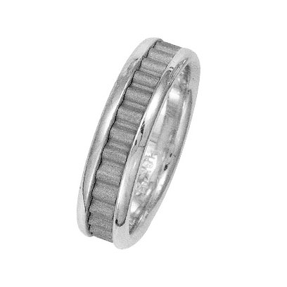 14Kt White gold classic wedding band. The ring is about 6.0 mm wide and comfort fit. The center of the ring has a unique handcrafted design with a sandblast satin finish. The outer edges are polished. Different finishes may be selected or specified.