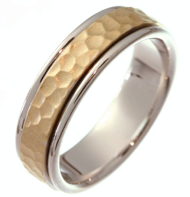 Platinum and 18 kt gold hammered wedding band. The ring is about 6.5 mm wide and comfort fit. The hammered portion of the ring is a matte finish and the outer edges are polished. Different finishes may be selected or specified.