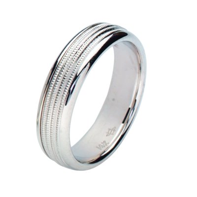 18Kt White gold wedding band. The ring is about 6.0 mm wide and comfort fit. The center has four milgrains with a matte finish. The outer edges are polished. Different finishes may be selected or specified.