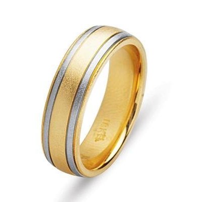 14Kt Two-tone gold wedding band. The ring is about 6.0 mm wide and comfort fit. The ring has a satin matte finish. Different finishes may be selected a or specified.