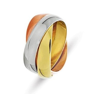 14Kt Tri-color gold Russian wedding band. The ring is about 5.0 mm wide and comfort fit. There are three interlocking bands. It is a polished finish. Different finishes may be selected or specified.