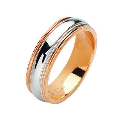 Platinum and 18 kt rose gold wedding band. The ring is about 6.5 mm wide and comfort fit with milgrain. Each side of the band has two milgrains. The ring is polished. Different finishes may be selected or specified.