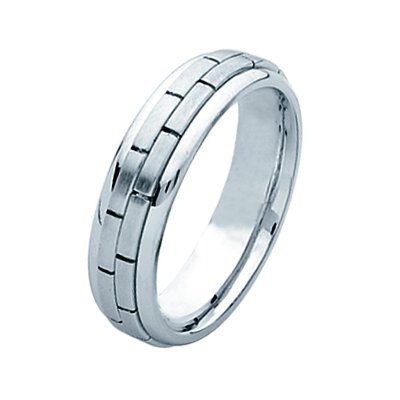 18Kt white gold hand made brick wedding band. The ring is about 6.0 mm wide and comfort fit. The brick pattern is matte and the outer edges are polished. Different finishes may be selected or specified.