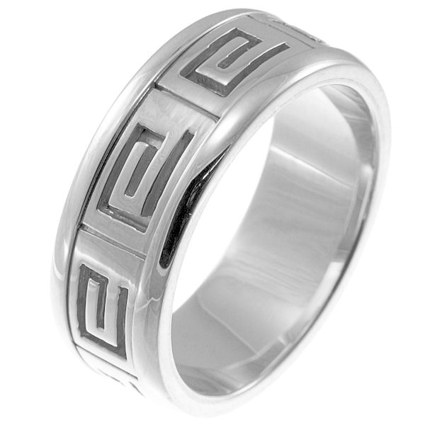 18 kt white gold greek spartan key wedding band. A hand crafted ring made with Greek motifs. The ring is about 8.0 mm wide and comfort fit. The whole ring is polished. Different finishes may be selected or specified.