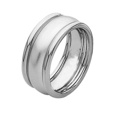 Platinum wedding band. The ring is about 9.0 mm wide and comfort fit. The center is a matte finish and the outer edges are polished. Different finishes may be selected or specified.
