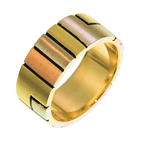 18Kt Tri-Color wedding band. The ring is about 8.0 mm wide and comfort fit. The ring is a brush finish and there is black antique between the grooves. Different finishes may be selected or specified.