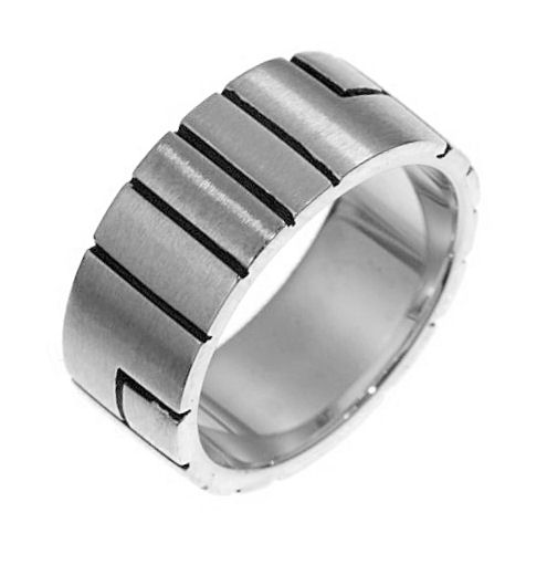 14Kt White gold wedding band. The ring is about 8.0 mm wide and comfort fit. The ring is a brush finish and there is black antique between the grooves. Different finishes may be selected or specified.