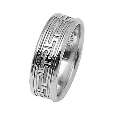 Platinum greek key wedding band. The ring is about 7.5 mm wide and comfort fit. The ring is polished. Different finishes may be selected or specified.