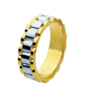 18Kt Two-tone wedding band. The ring is about 7.0 mm wide and comfort fit. The ring has a non-flexible watch band style. This ring is polished. Different finishes may be selected or specified.
