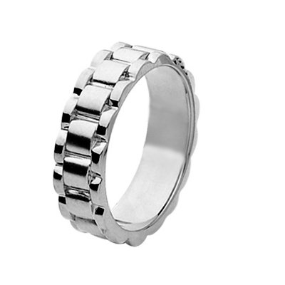Platinum wedding band. The ring is about 7.0 mm wide and comfort fit. The ring has a non-flexible watch band style. This ring is polished. Different finishes may be selected or specified.