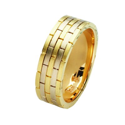 18Kt Two-tone hand made brick wedding band. The ring is about 8.0 mm wide and comfort fit. The ring has a brick-style pattern around the band and a matte finish. Different finishes may be selected or specified.