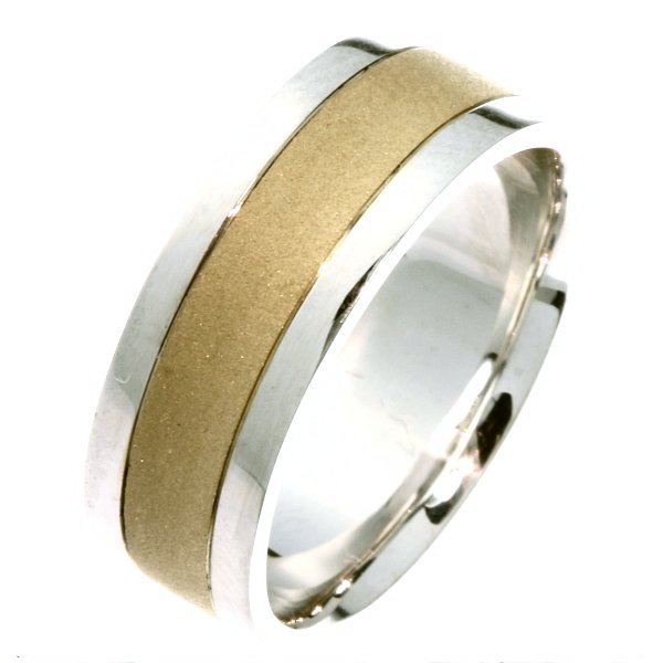 Platinum and 18 kt wedding band. The ring is about 8.0 mm wide and comfort fit. The center is a coarse sandblast finish and the outer edges are polished. Different finishes may be selected or specified.