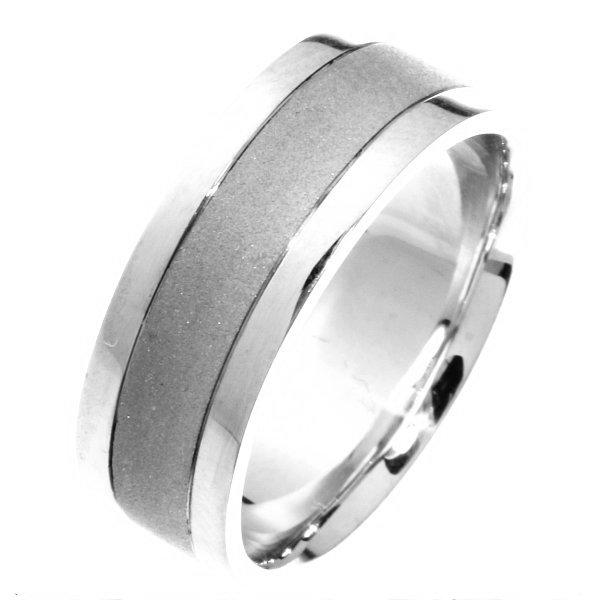 14Kt White gold wedding band. The ring is about 8.0 mm wide and comfort fit. The center is a coarse sandblast finish and the outer edges are polished. Different finishes may be selected or specified.