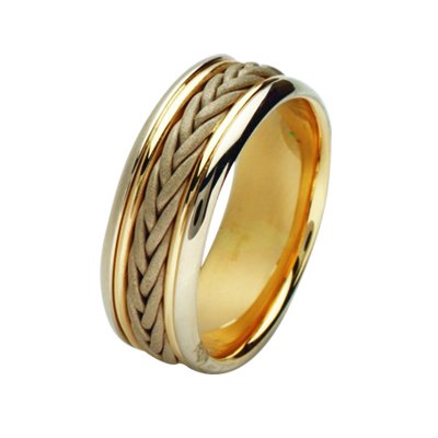 Platinum and 18 kt hand made braided wedding band. The ring is about 8.0 mm wide and comfort fit. There is a handmade braid in the center that has a sandblast matte finish. The rest of the ring is polished. Different finishes may be selected or specified.