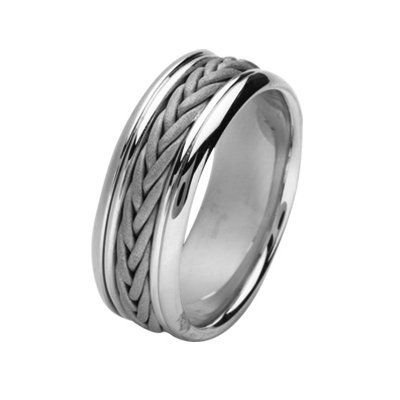 18Kt White gold hand made braided wedding band. The ring is about 8.0 mm wide and comfort fit. There is a handmade braid in the center that has a sandblast matte finish. The rest of the ring is polished. Different finishes may be selected or specified.