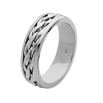 18Kt White gold hand made braided wedding band. The ring is about 7.0 mm wide and comfort fit. The center has a hand made braid that has a matte finish. The outer edges are polished. Different finishes may be selected or specified.