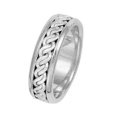 14Kt White gold hand made braided wedding band. The ring is about 7.0 mm wide and comfort fit. The center has a hand made rope braid that has a matte finish. The outer edges are polished. Different finishes may be selected or specified.